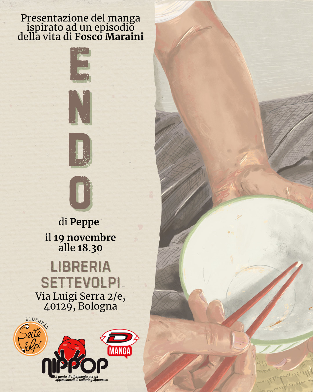 NipPop e la Libreria Sette Volpi vi invitano alla presentazione di ENDO, edito da Dynit Manga nella collana Showcase con la traduzione di Luca Mencarelli, il nuovo graphic novel di Peppe, giovane mangaka italiano residente a Tokyo. ENDO racconta gli anni che Maraini trascorse con la moglie Topazia Alliata e le figlie Dacia, Yuki e Toni a Kyoto fino al drammatico internamento in un campo di concentramento vicino a Nagoya, conseguenza del loro rifiuto di giurare fedeltà alla Repubblica di Salò.